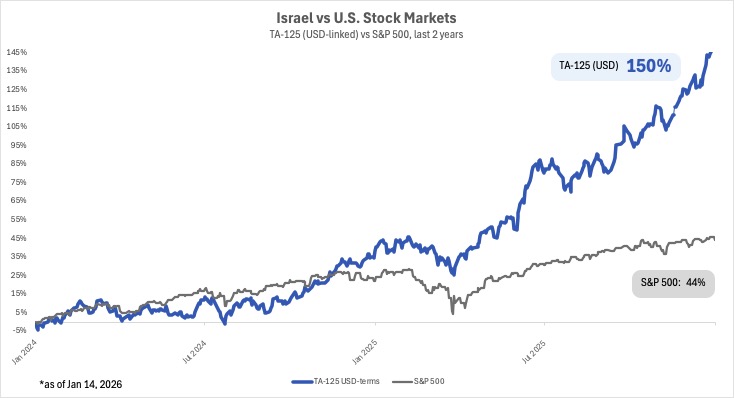 Even as Israel faced a seven front war, its stock market surged over the past two years (over 111% growth, or 150% in USD-terms).